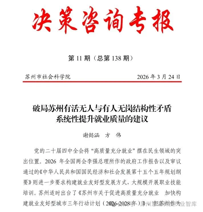 近日,由苏州慧湖科技产业智库研究员谢懿涵,苏州市委党校二级调研员、苏州专家咨询团成员方伟撰写的决策咨询报告《破局苏州“有活无人”与“有人无岗”结构性矛盾 系统性提升就业质量的建议》,获苏州市社会科学院内参采用,为破解苏州市就业结构性矛盾提供了重要决策参考。