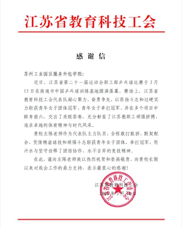 3月18日,江苏省教育科技工会专门向我校发来感谢信,对左陈在赛事中展现出的敢打敢拼、奋勇争先的拼搏精神给予高度评价,对其为全省教育科技系统争得荣誉表示诚挚感谢,同时对我校长期以来对江苏省教育科技工会的支持表示感谢。
