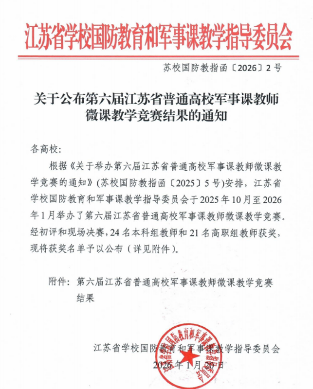 1月底,第六届江苏省普通高校军事课教师微课教学竞赛结果正式公布,我校学工处、人武部选派的军事理论课教师张亚云获高职组二等奖、李中华获高职组三等奖,展示了我校在军事理论课程建设与教学改革方面的良好成效。