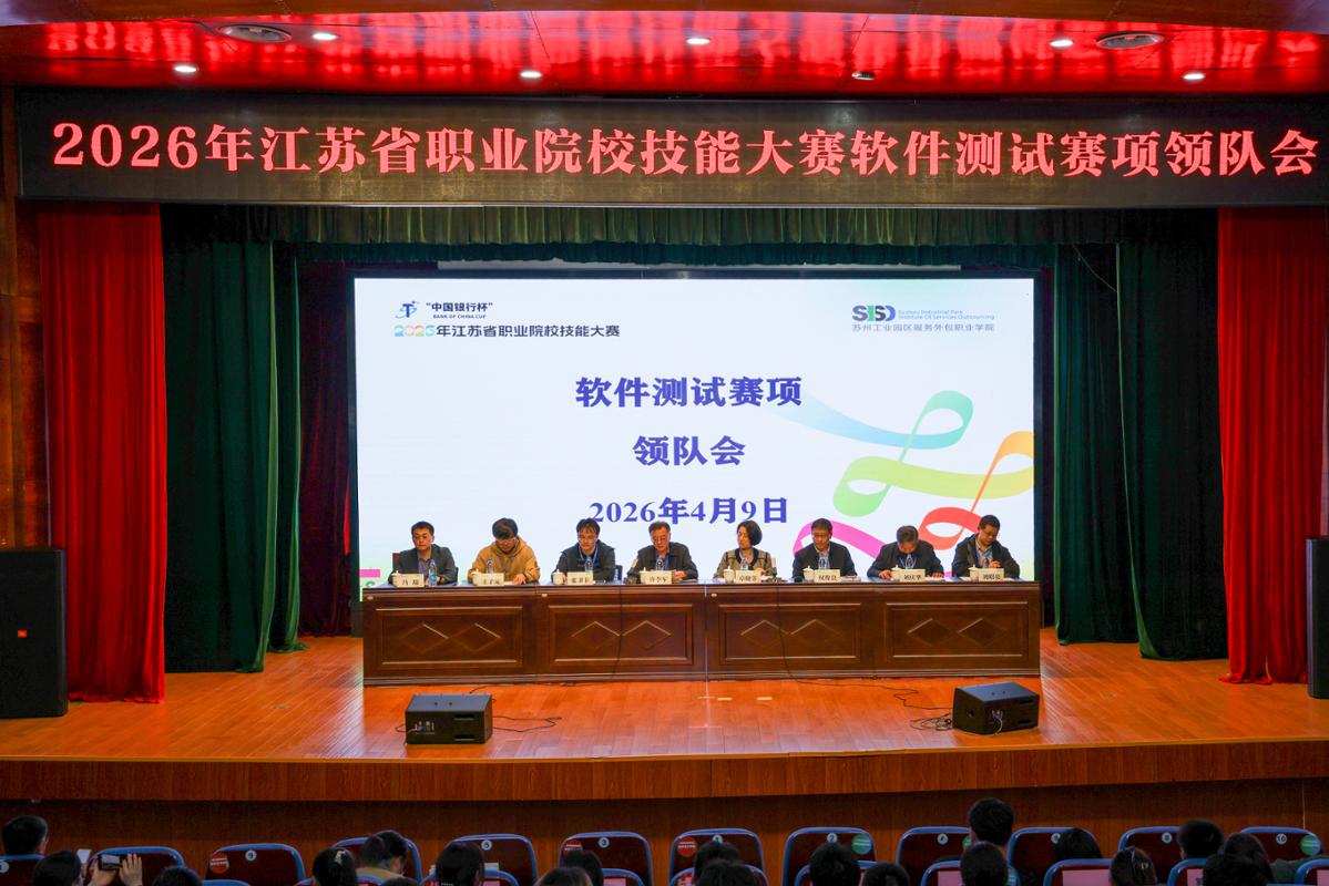 4月9日下午,2026年江苏省职业院校技能大赛新一代信息技术赛道·软件测试赛项领队会在我校善仁楼召开。本次大赛由江苏省教育厅、省发改委、省工信厅等15家单位主办,我校承办。大赛巡视员许李军、专家组长章晓芳、专家代表王子元、裁判长张卫丰、监督员刘庆华、联络员刘昭亮,我校党委副书记、校长权俊良,副校长冯瑞,全体领队、指导教师、参赛选手、技术支持企业代表以及我校相关工作人员共同参会。会议由许李军主持。
