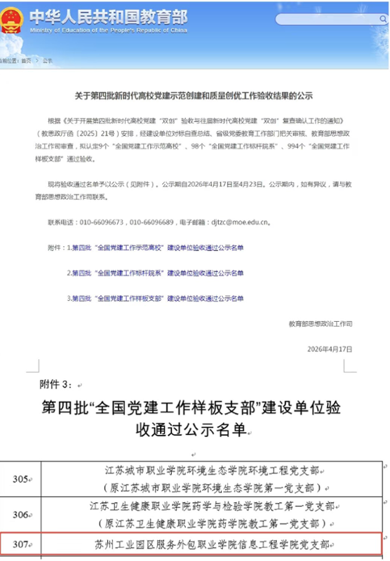 4月17日,教育部思想政治工作司公布了第四批新时代高校党建示范创建和质量创优工作验收结果,我校信息工程学院党支部顺利通过“全国党建工作样板支部”验收,这是继商务管理学院党支部通过“全国党建工作样板支部”验收之后,我校第二个通过此项验收的基层党支部,标志着学校党建“双创”工作国家级荣誉再添新成果。