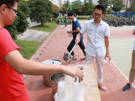 19日中午烈日炎炎,学生会部分成员聚集在训练场,带来了清凉可口的酸梅汤给教官和同学们解渴。同学们在教官的指令下原地休息后,惬意地享受着酸梅汤带来的清凉。学长学姐以“过来人”身份与新生们交流军训心得。新生们纷纷表示,军训虽然很累,但是收获颇丰,而学长学姐送来的酸梅汤,带来了凉爽,也带来了莫大的鼓励。