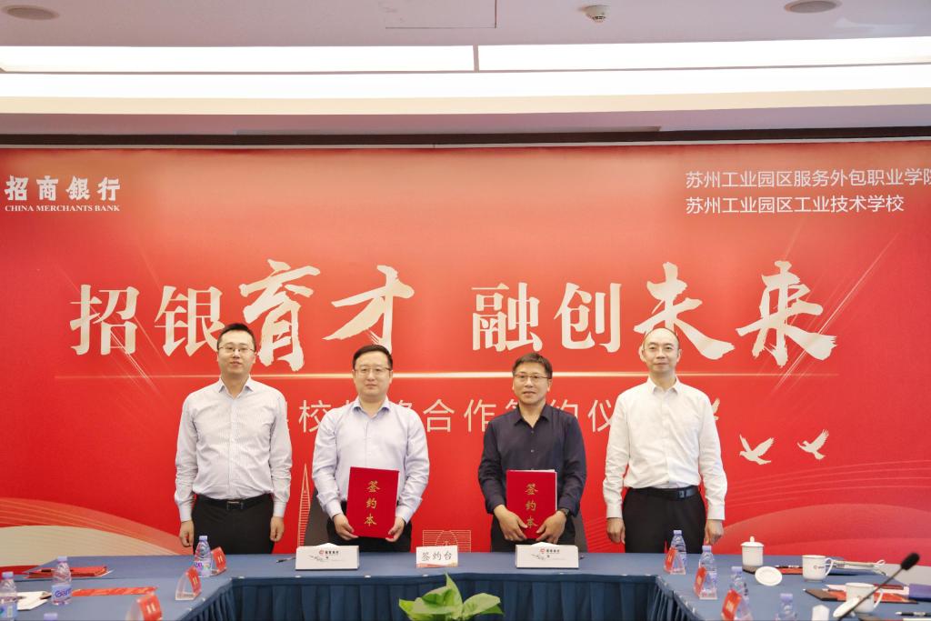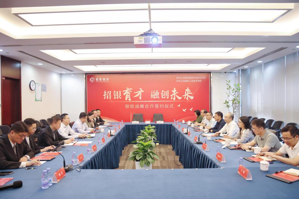 5月14日下午,我校与招商银行股份有限公司苏州分行在招银大厦303会议室举行了战略合作协议签约仪式,双方将围绕人才培养、金融服务、智慧校园系统开发等领域展开深度合作,携手探索“金融+教育”双生态融合的全新路径,为职业教育现代化发展、金融行业发展注入源源不断的动力。招商银行苏州分行行长、党委书记李骅,招商银行苏州分行副行长段亮;苏州工业园区教育局局长、我校党委书记顾纯青,园区教育局职教处副处长顾沈静;学校党委副书记、校长权俊良,副校长冯瑞,图文信息中心主任蒋建锋、合作交流处处长徐叶军等参加了签约仪式。