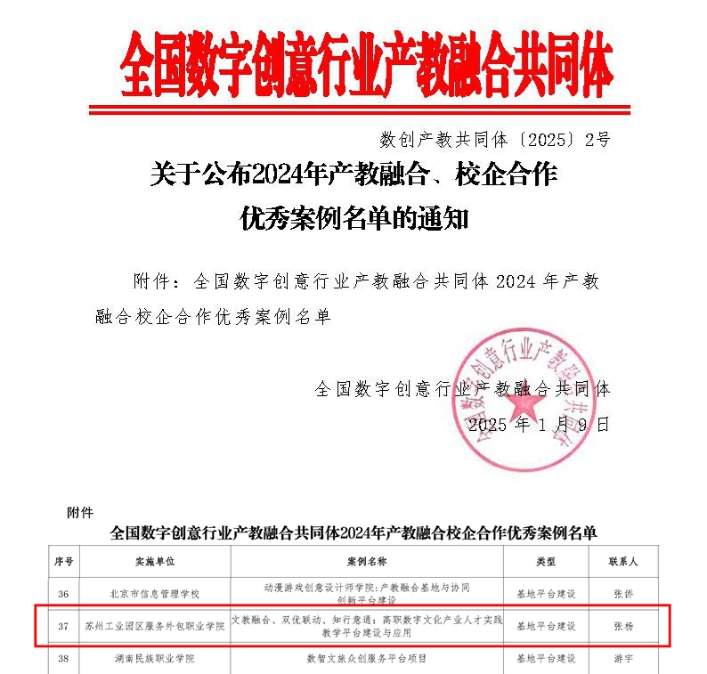 1月9日,全国数字创意行业产教融合共同体正式公布了2024年产教融合、校企合作优秀案例名单,我校数字艺术学院申报的“文教融合、双优联动、知行意通:高职数字文化产业人才实践教学平台建设与应用”案例脱颖而出,成功入选,标志着我校在产教融合、校企合作方面的探索与实践获得了行业认可。