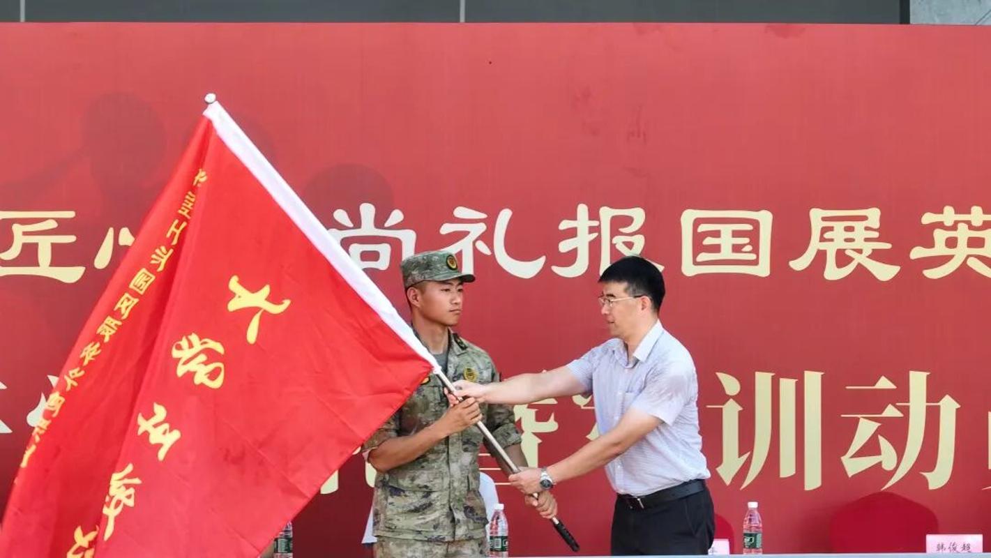 杜梓平代表学校向2025级军训团总教官授团旗,各连队教官入列。