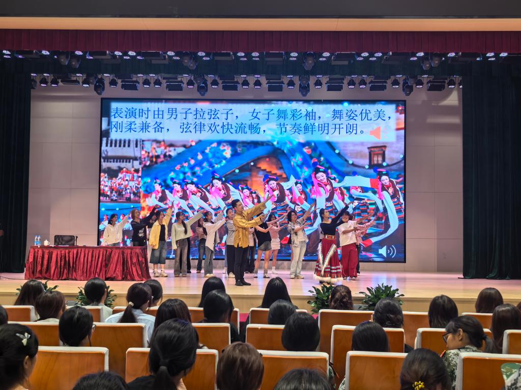 邓敏还分享了其他大型活动导演经验,强调美育应该打破场馆限制,融入日常生活。“美育不仅在春晚舞台,也在校园的每个角落。无论是社团演出还是班级活动,都可以成为美育实践的现场。”在互动环节,聚光灯下,同学们踏上舞台中央,在邓敏老师和吴丹老师的指导下零距离互动,亲身感受舞蹈的韵律与情感表达,深刻感悟到形体艺术背后的文化魅力与自信之美。