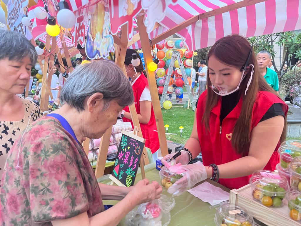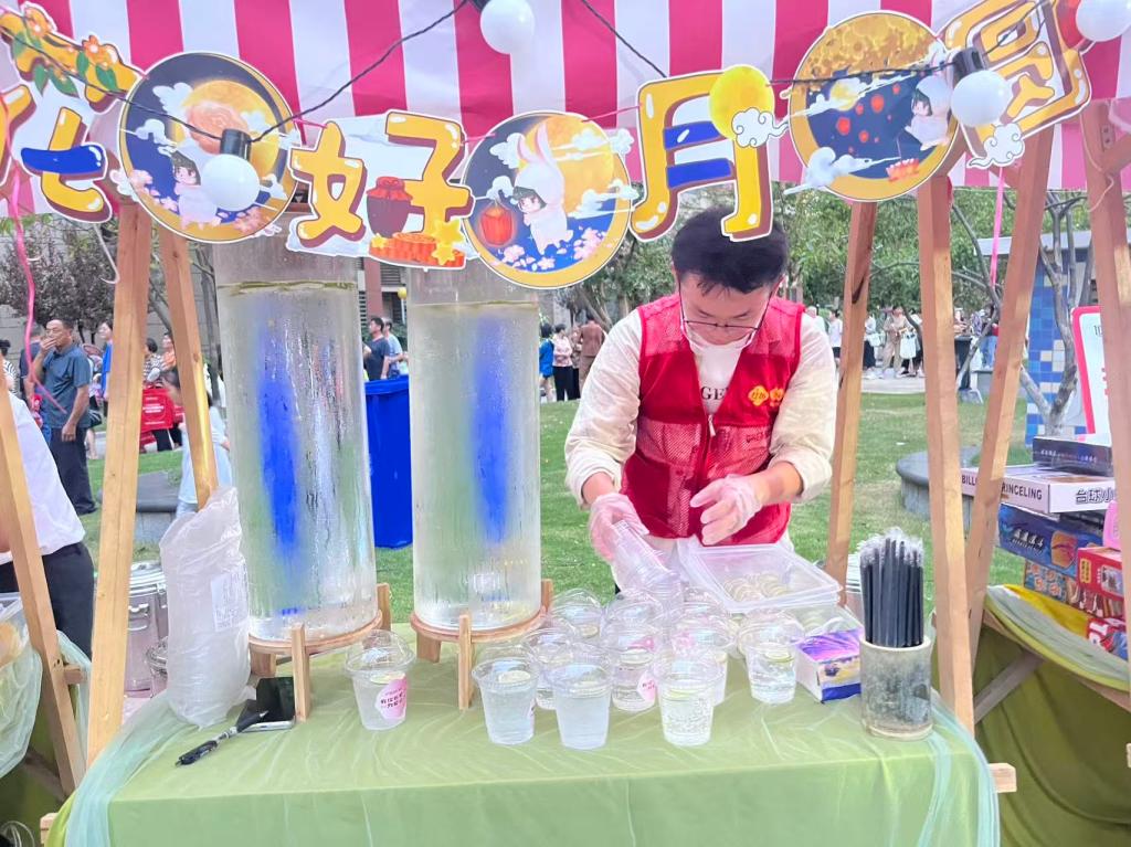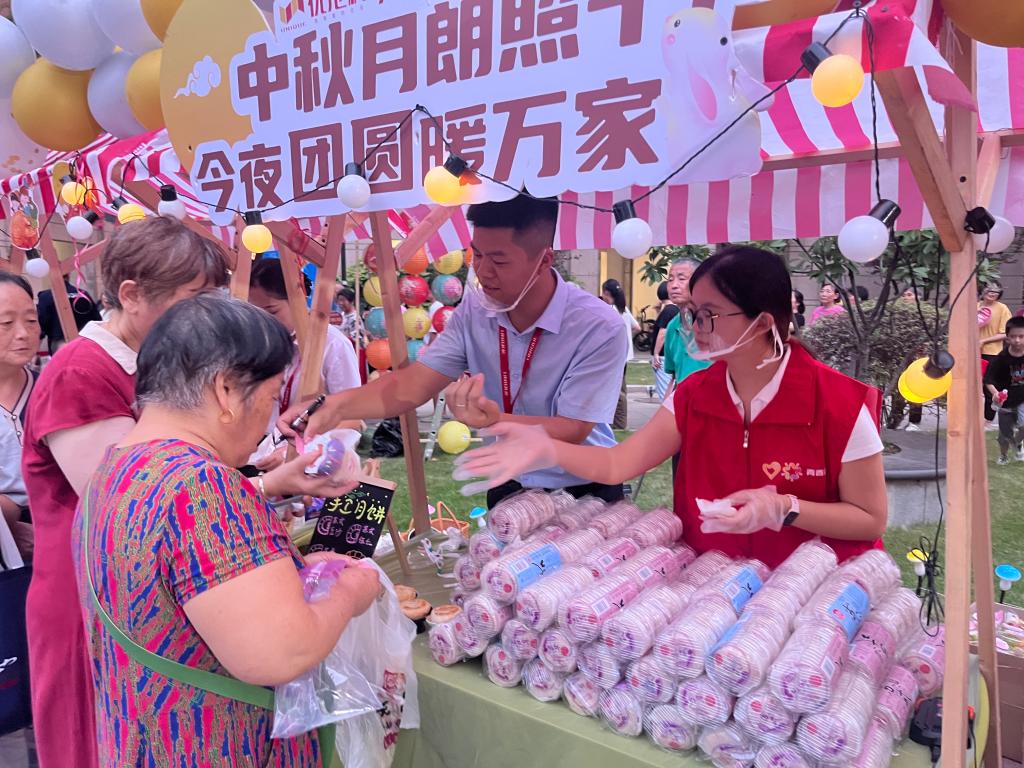 在斜塘街道中秋主题市集上,我校志愿者为居民精心准备茶饮,从饮品分装到递送到手,每一个环节都传递着“奉献”的温度。水果摊位前,志愿者为老人介绍特色果品。从民俗游戏到便民服务,志愿者们用多元形式让社区双节活动既有文化厚度,又有民生温度。