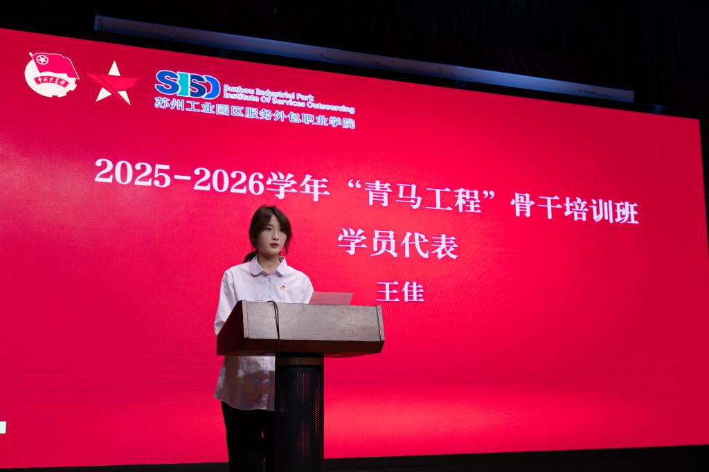 王佳作为2025-2026学年“青马工程”骨干培训班学员代表发言。她倡议全体成员做到知行合一、注重团结互助、争当先锋榜样,努力成为马克思主义的坚定信仰者、积极传播者和忠实践行者。