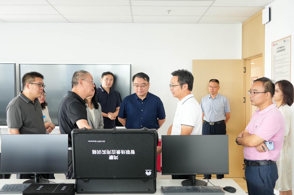 调研首站聚焦位于我校闻道楼八楼的苏州工业园区产教融合实践中心。徐叶军详细介绍了实践中心的筹建背景、定位目标与当前运营成效,重点展示了中心核心教学与实践载体——鸿蒙智能创新实训室、昇腾AI创新工作室、鲲鹏大数据实训室、新一代信息通信实训室等6个专业化实训室,以及严格按照国际标准打造的 VUE 考试中心。各实训室的前沿设备配置、贴合产业需求的教学场景设计与 VUE 考试中心的国际化认证服务能力,得到了调研团一致关注。