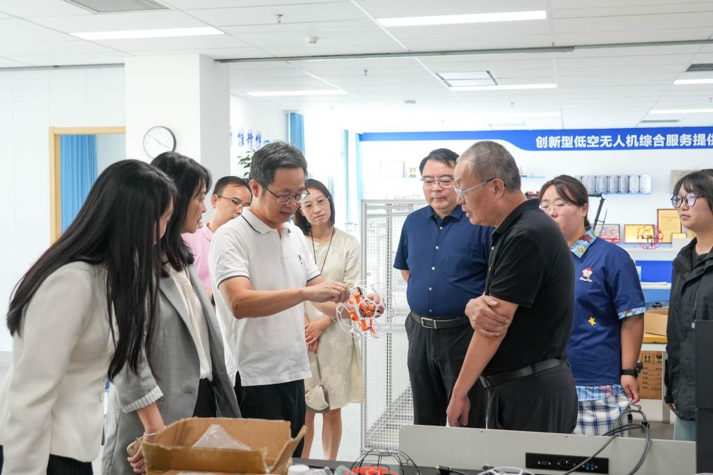 随后,调研团一行前往我校产业园,实地考察入驻企业苏州恒井泰信息技术有限公司。在企业现场,调研团参观了无人机等核心技术设备,深入了解该公司与我校在人才联合培养、技术协同攻关、实习实训基地共建等校企合作领域的成果。