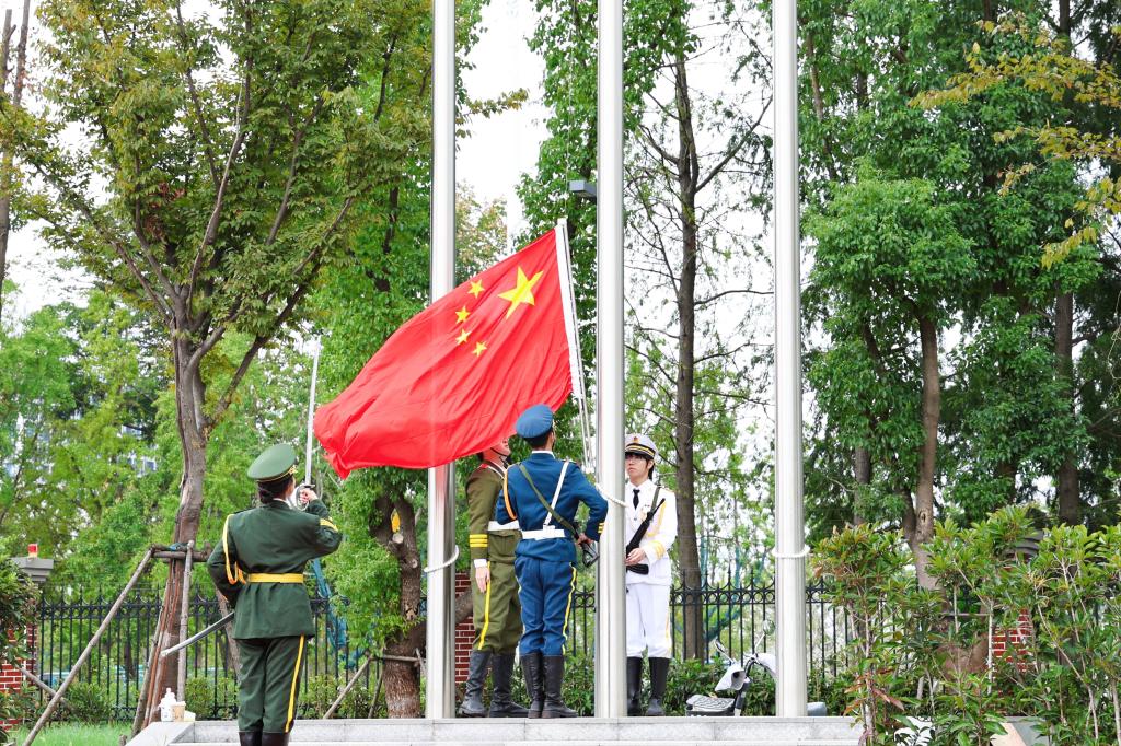 入场仪式结束后,全体师生肃立,伴随着庄严的国歌声,国旗在万众瞩目中冉冉升起。