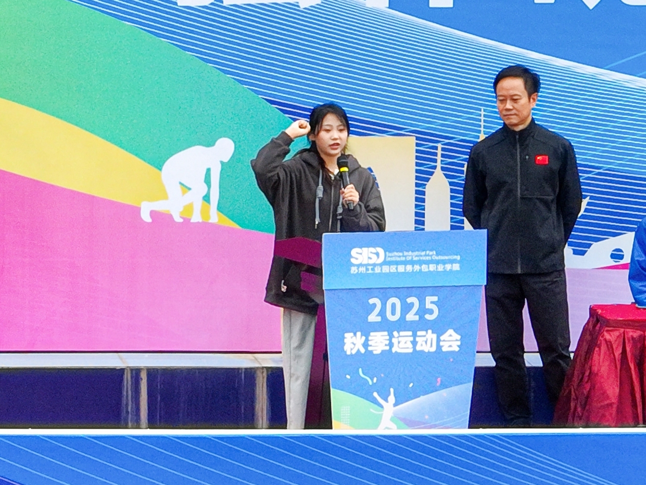 生物科技学院药质241班学生冯媛媛代表运动员庄严宣誓,将严格遵守比赛规则,尊重对手、尊重裁判,以饱满热情投入比赛,展现当代大学生的体育精神。