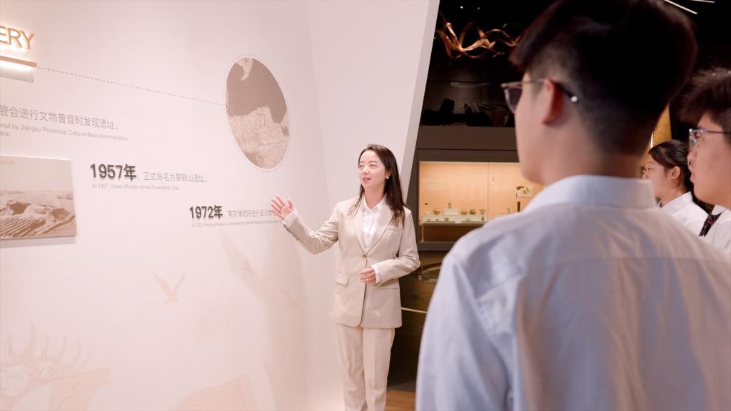 稻作文明的智慧之光。在讲解员肖静超的带领下,学生们首先走进了草鞋山遗址的核心区域。这里集合了时空之门、夷陵山、主题展厅、古水稻田场景复原等多个功能空间。肖静超详细介绍了草鞋山遗址的历史背景及其在考古学上的重要地位,为学生们揭示了长江下游地区新石器时代的文明进程。