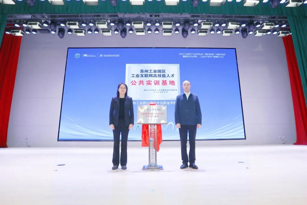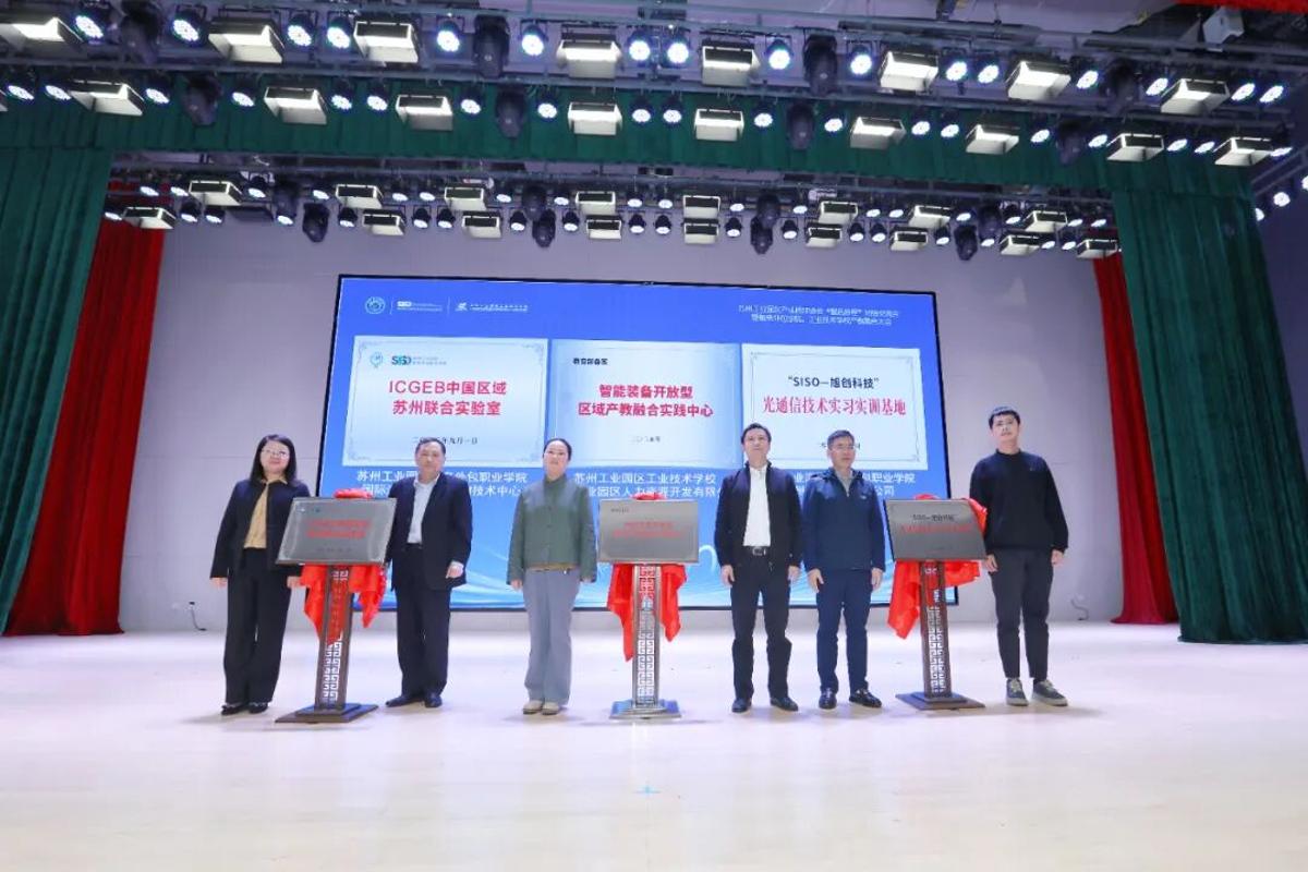 大会现场举行了6个重点产教融合平台揭牌仪式。园区人力资源和社会保障局党组书记、局长陈华与园区教育局党组书记、局长顾纯青共同为“苏州工业园区工业互联网高技能人才公共实训基地”揭牌;独墅湖科教创新区党工委委员、管委会副主任陈淼与苏州工业园区人力资源开发有限公司副总经理张晓光共同为“智能装备开放型区域产教融合实践中心”揭牌;园区教育局副局长刘海燕与国际遗传工程与生物技术中心中国区域研究中心主任杨义力共同为“国际遗传工程和生物技术中心(ICGEB)中国区域苏州联合实验室”揭牌;园区人力资源和社会保障局副局长陈继洪与苏州旭创科技有限公司经理林灿煌共同为“SISO—旭创科技光通信技术实习实训基地”揭牌;我校副校长冯瑞与网易有道信息技术(杭州)有限公司经理毛玲苏为“网易数字艺术生产性实训基地”揭牌;工业技术学校副校长葛增国与苏州伊恩动漫有限公司副总经理宋佳杰为“伊恩动漫生产性实训基地”揭牌。一系列平台的成立,将进一步完善园区产教融合基础设施,为人才培养提供更优质的实践载体。