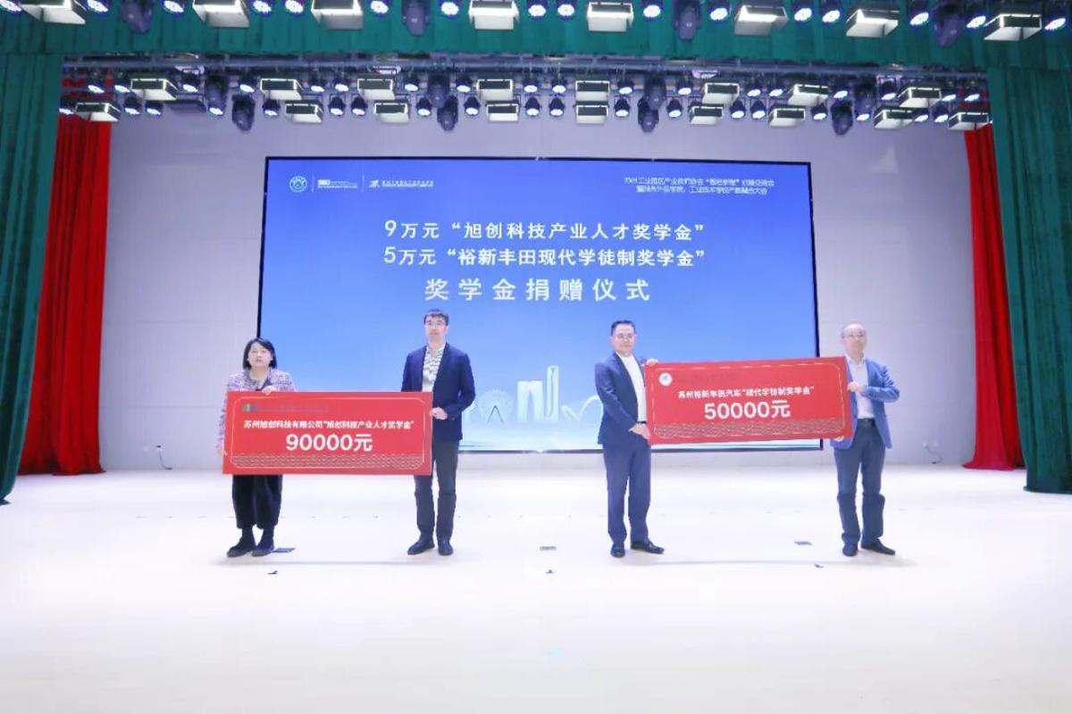 为鼓励学生深耕专业领域、提升技能水平,大会现场举行两项奖学金捐赠仪式。苏州旭创科技有限公司向我校捐资9万元人民币设立“产业人才奖学金”,我校副校长杜梓平与苏州旭创科技有限公司人事经理莫丽娜共同见证;苏州裕新丰田汽车销售服务有限公司向工业技术学校捐赠5万元设立“裕新丰田现代学徒制奖学金”,工业技术学校副校长李友节与苏州裕新丰田汽车销售服务有限公司董事长黄建刚共同见证。企业奖学金的设立,将为学生成长提供有力支持,助力培育更多符合产业需求的技能型人才。