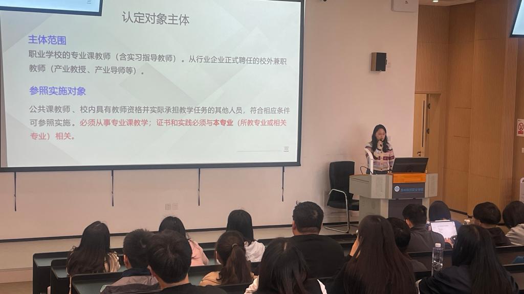 会上,教师发展中心王维老师围绕认定工作,从认定范围、时间安排、流程说明、条件标准、政策解读五个方面展开专题讲解。针对教师普遍关注的“双师型”教师准入要求,王维通过讲述“直接认定”与“申请认定”的差异化标准,帮助教师更加直观地理解“双师型”教师的内涵要求。