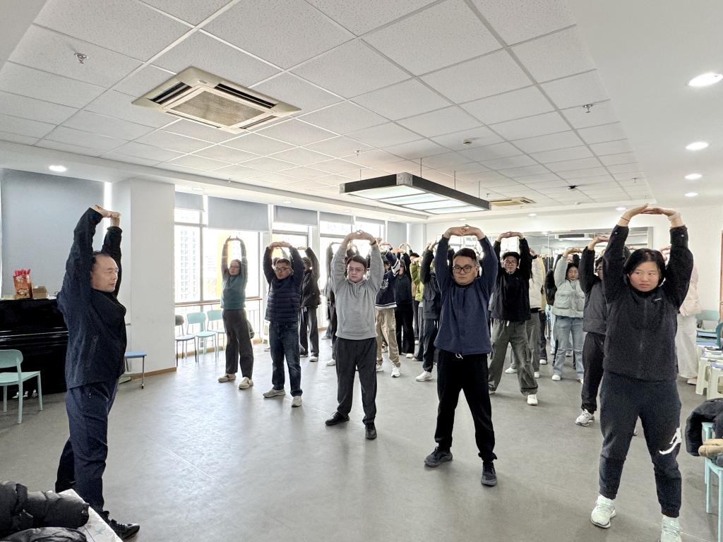 理论讲解结束后,张宗豪还现场示范,带领师生一同练习八段锦。从“双手托天理三焦”的伸展提拉,到“左右开弓似射雕”的舒展扩胸,再到“背后七颠百病消”的提踵颠足 ,每一个动作张宗豪都耐心指导,详细纠正师生们的姿势,让大家在亲身体验中感受八段锦的独特魅力。
