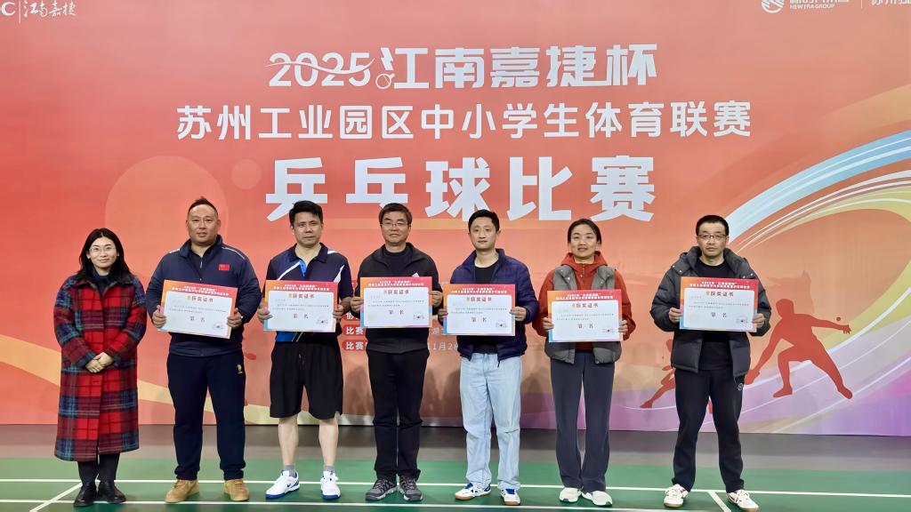 11月28日,由苏州工业园区教育工委主办的2025年园区教工乒乓球混合团体赛在独墅湖体育中心举行。在我校工会的认真组织和前期选拔基础上,由林涛担任领队,冯瑞、顾家乐、曹顺、王海霞、徐芃、强理娴等六名教职工组成的学校代表队团结协作、奋勇拼搏,历经多轮角逐,最终夺得本次比赛教工组亚军。