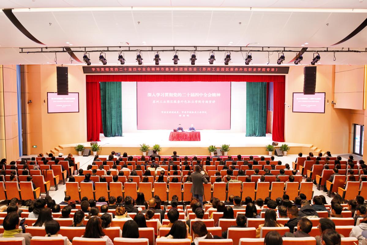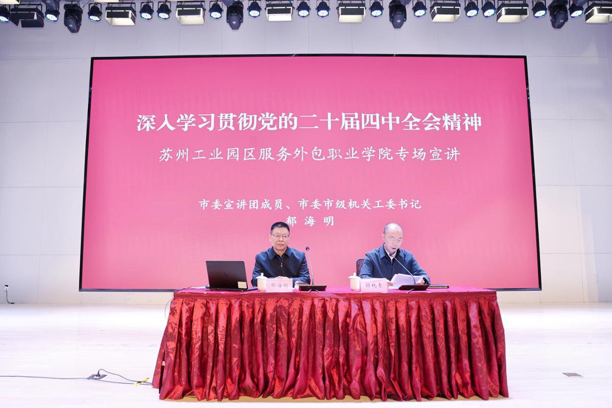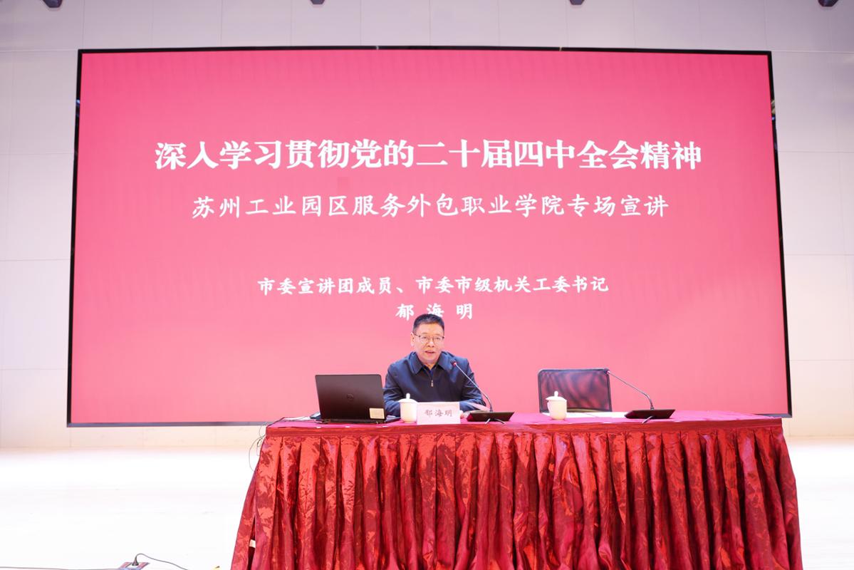 12月3日,学习贯彻党的二十届四中全会精神市委宣讲团苏州工业园区服务外包职业学院专场宣讲报告会在我校闻道楼报告厅举行。苏州市委宣讲团成员、市委市级机关工委书记郁海明作宣讲报告。我校党委书记顾纯青主持报告会,全体教职工、学生代表约500人聆听了报告会。