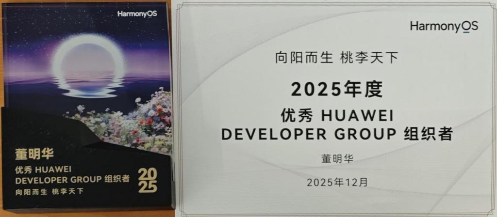 2025年12月20日,“2025 HarmonyOS人才布道师年度论坛”在重庆举行,本次论坛汇聚全国高校教师、华为开发者专家等数百位嘉宾,共同探讨鸿蒙生态人才培养新路径。我校信息工程学院董明华老师受邀参会,并凭借在鸿蒙生态推广与开发者社区建设中的突出表现,荣获“2025年度优秀华为开发者社区组织者”荣誉称号(全国共23人,苏州1人)。
