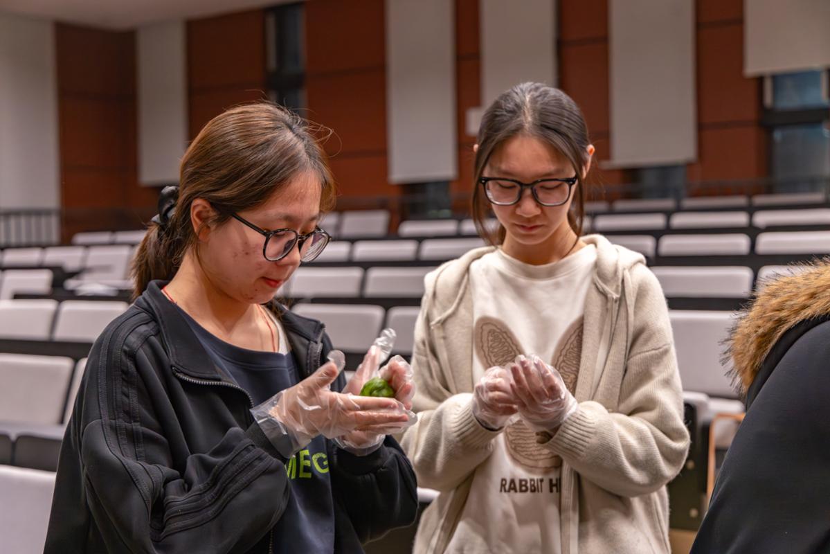 香囊制作的余韵未散,青团手作环节随即登场,成为本次活动的又一亮点。学院学生会提前备好软糯清香的青团皮,还准备了红豆沙、香芋泥、奶黄馅、香甜板栗四种经典馅料,充分满足同学们的多样口味需求。同学们领取青团皮与心仪馅料后,纷纷动手实践,从最初的揉捏生疏、包馅笨拙,到后来的手法娴熟、收口利落,在一步步摸索尝试中感受手作的乐趣。一个个圆滚滚、胖乎乎的青团在同学们手中逐渐成型,形态各异却皆憨态可掬,满满都是手作的温度。