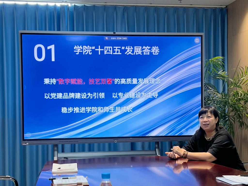 学院党支部书记、院长张杨总结了学院“十四五”发展答卷并为“十五五”做了规划和目标。她强调,要进一步明确“以群建院”的发展理念,围绕“党建引领、人才培养、科技创新、师资建设、开放合作”五大核心任务,推动专业集群与产业需求精准对接,进一步深化校企协同育人。在具体实践中,人才培养要坚持“技艺双馨”理念,将专业技能训练与艺术审美培育紧密结合,打造独具特色的人才培养模式;党建工作要重点推进“寻艺筑梦”品牌建设,推动党建工作与教学、科研、育人工作深度融合。成果转化需树立“作业→作品→商品”的进阶导向,鼓励教师指导学生将课程成果转化为具备市场价值的产品;技术赋能则要紧扣“十五五蓝图”与“数字文化+”战略,以“数字引领、智能跨越”为方向,在教学中主动应用AI技术,不断提升课程科技含量。