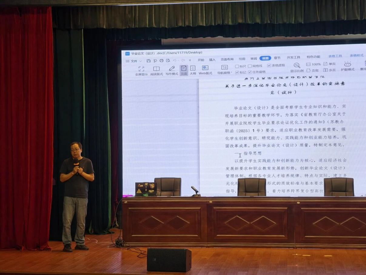 嵌入式技术应用专业主任刘辉对毕业论文(设计)改革政策进行说明,明确学术论文、竞赛获奖、专利、创新创业项目等多种成果形式均可作为毕业设计替代方案,突出对学生真才实学和实践能力的重视。