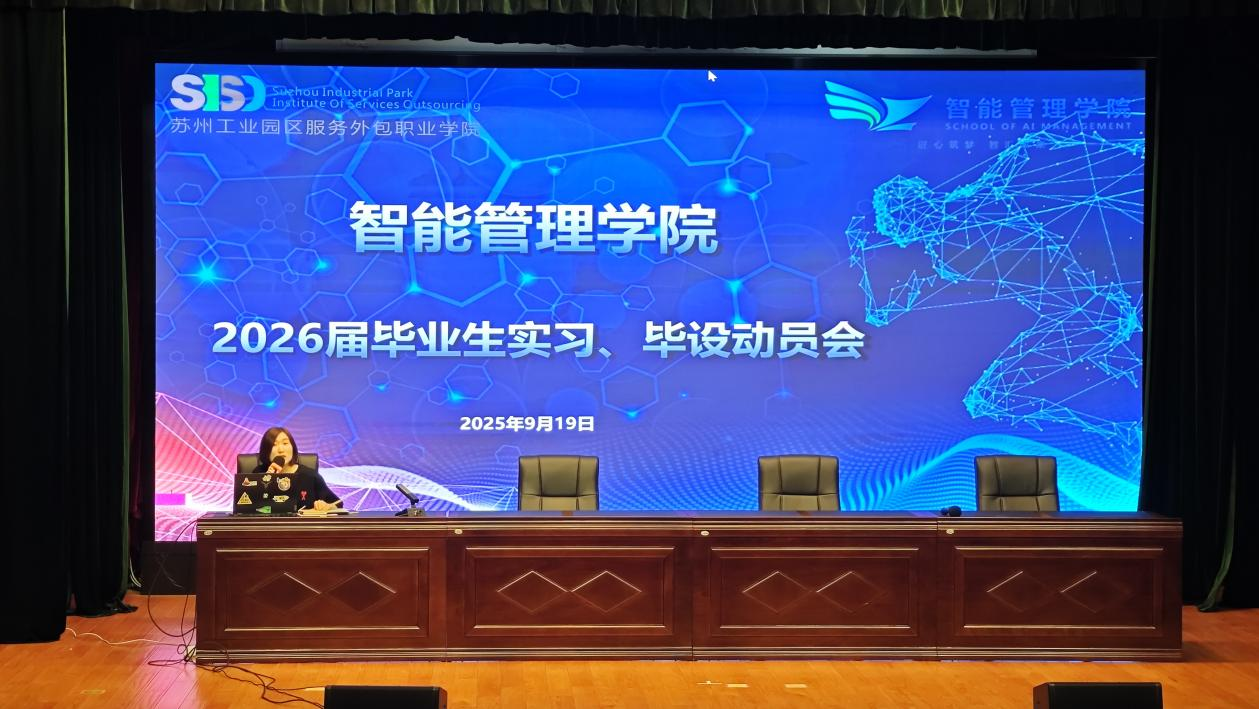 9月19日下午,智能管理学院在善仁楼影剧院组织召开2026届毕业生实习、毕设动员会暨旭创科技实习宣讲会。会议由智能管理学院党支部书记、副院长陈强主持,合作交流处处长徐叶军,智能管理学院党支部副书记、副院长夏燕,专业教师、班主任、企业代表及2026届毕业生共同参会。