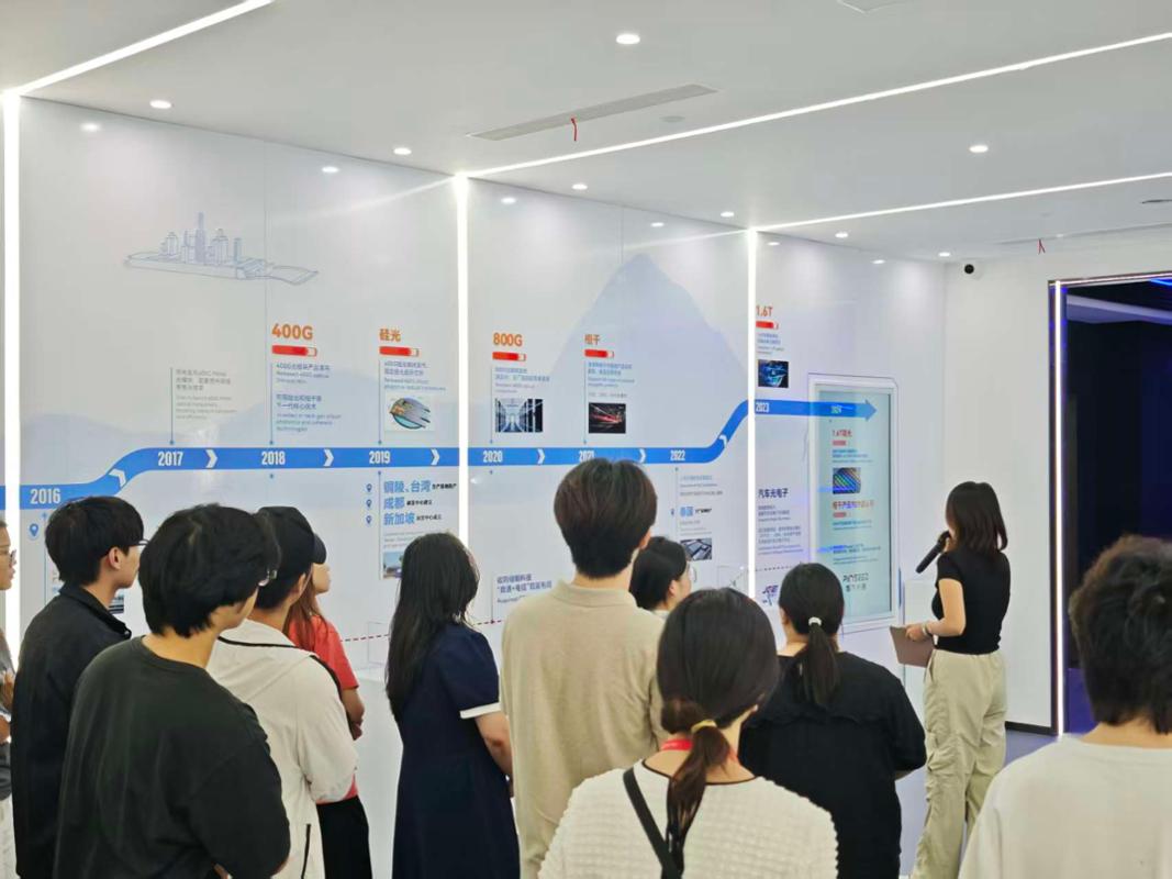 临近展厅参观尾声,“光连万物”宣传片播放时,讲解员补充了光通信技术在数据中心互联、AI算力支撑等领域的案例,让企业定位不再抽象,也让大家对行业前景有了真切认知。这一充满潜力的领域,正待同学们通过旭创实习或其他实践机会深入探索。