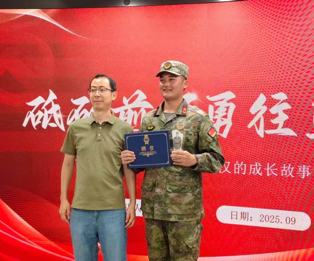 分享会伊始,主持人详细介绍了王书伟的履历。他在校期间专业成绩优异,在“奇迹杯”数字建模比赛、“江南文脉杯”创新创业大赛等省市级赛事中斩获佳绩;毕业后投身国防事业,服役期间荣获“四有优秀士兵”称号及“嘉奖”,现持续为国防事业贡献力量。