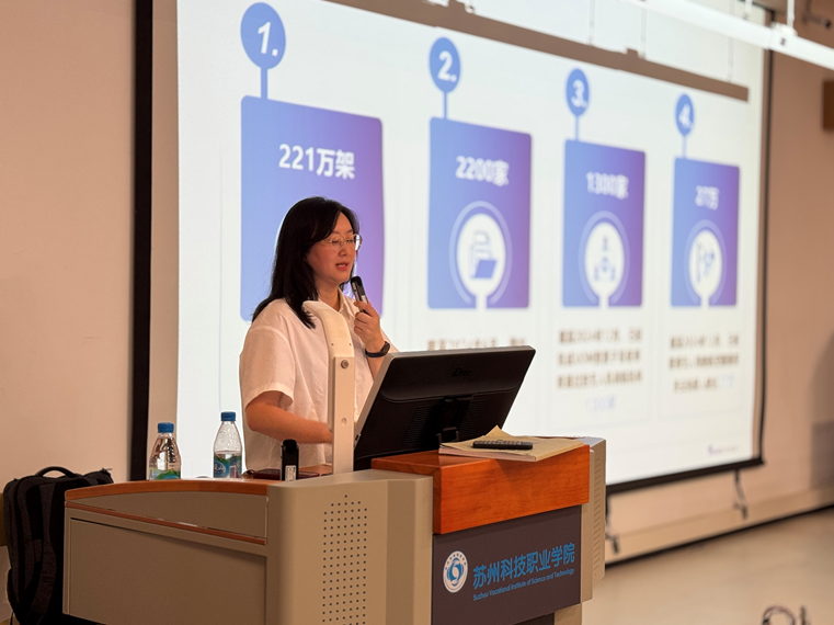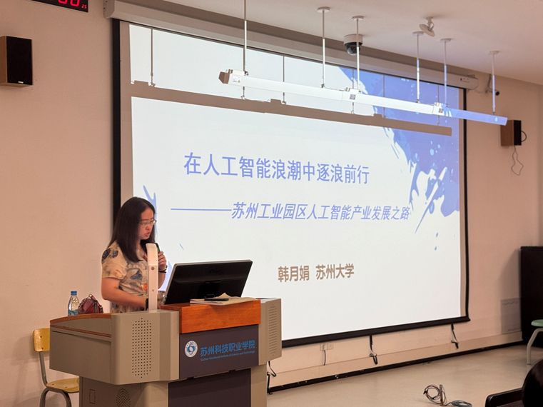 科协紧扣科技发展脉搏,精心策划了本次讲座。讲座上半场,韩月娟以“在人工智能浪潮中逐浪前行——苏州工业园区人工智能产业发展之路”为题,系统解读了苏州工业园区人工智能产业的发展历程与未来图景。她结合自身在分布式系统、智慧校园等领域的研究成果,以详实的案例揭示了技术转化的巨大潜力,为听众带来了宝贵的行业前沿知识,激发现场学生浓厚的兴趣。