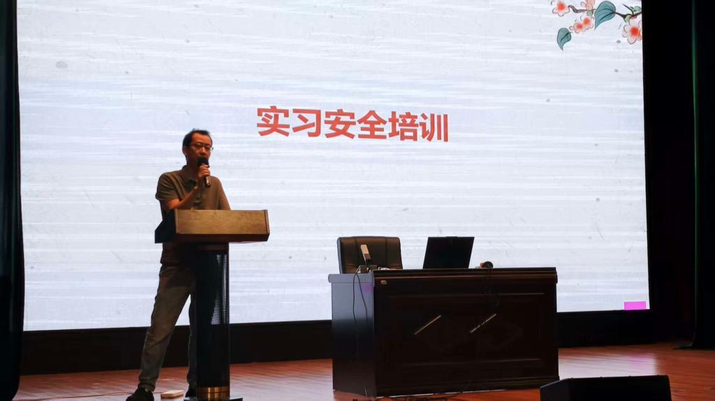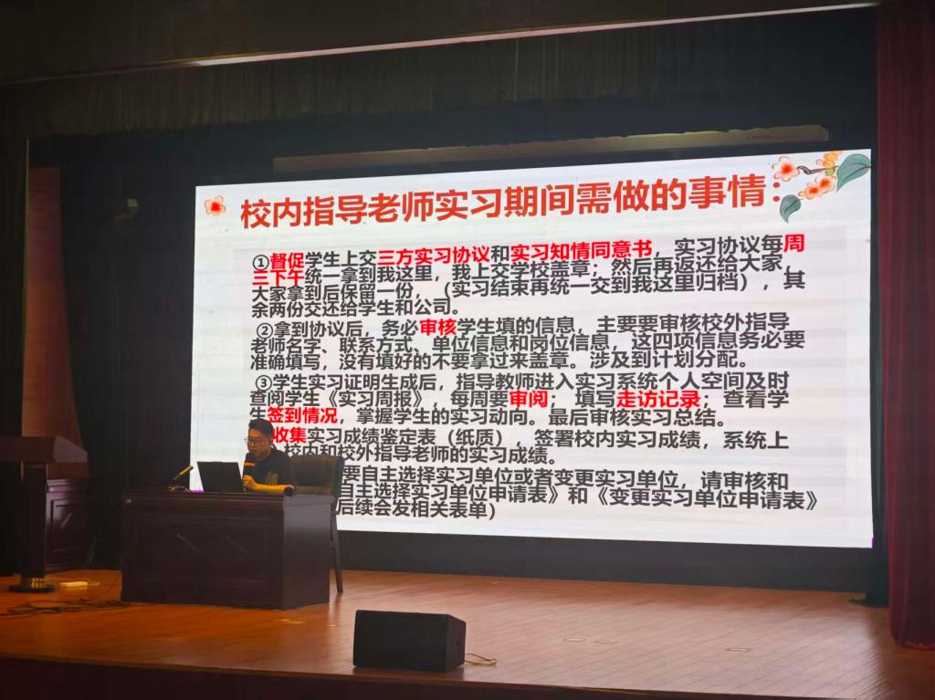 会上,教务秘书赵国殷就实习政策、全流程管理及线上系统操作等内容进行解读,明确指导教师与学生权责分工、实习任务填报规范等关键要点,确保每位学生清晰掌握实习各阶段执行标准;辅导员徐飞扬结合历年典型案例,从出行、人身财产、网络信息等多维度开展安全专题培训,深入剖析风险隐患,提出针对性防范措施与应急处理方法,引导学生牢固树立“安全是实习底线”的意识。
