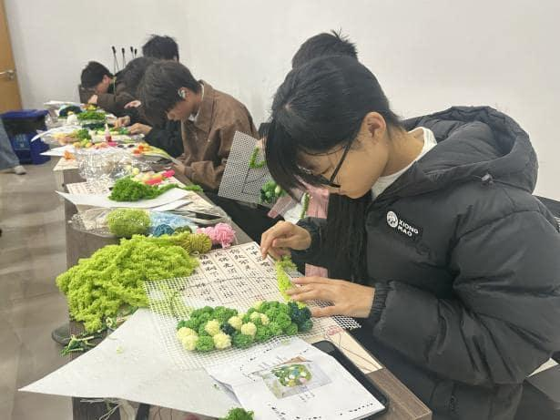 活动开始,指导老师现场演示并详细讲解了绕线基础技法、色彩搭配原则、苔藓固定方式及杯垫塑形要点,针对初学者常见问题进行了重点解析。随后,参与者进入自主创作阶段,依据个人偏好选择材料与配色,专注进行穿线、铺苔等操作,在一针一线的编织与自然元素的组合中展现创意与巧思。