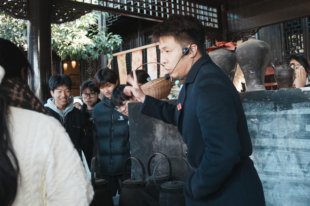 从广场出来,队伍随即抵达春来茶馆。这座看似普通的老茶馆,曾是革命年代的秘密联络点——地下工作者以“喝茶”为暗号传递情报,不起眼的陶罐里藏过作战文件,墙角的竹篮是运送物资的伪装。大家围站在古旧的陈设旁,看着斑驳的桌沿与磨损的茶具,仿佛能听见当年压低声音的暗号对话,真切触摸到隐蔽战线的赤诚与智慧。