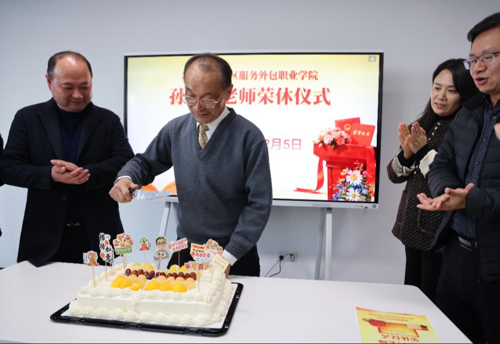仪式中,徐叶军代表部门为孙卫兴献上鲜花,郑亚君代表工会向孙卫兴赠送纪念品,以此感谢他数十年来为学校发展所付出的心血与努力。孙卫兴与在场人员共同切开荣休蛋糕,现场掌声与欢笑交织,将仪式氛围推向高潮。
