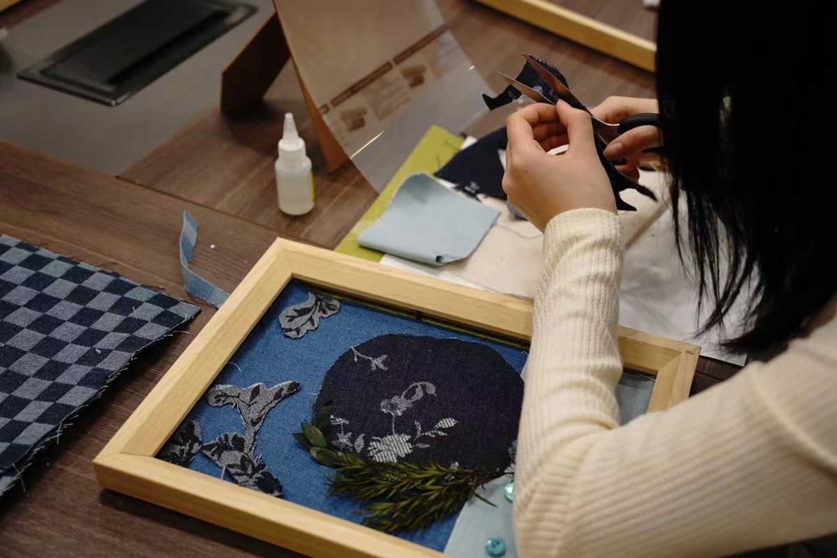 创作实践环节,工作人员为参与者发放废旧牛仔布、干花、纽扣、针线、胶水、画纸、相框等创作材料,结合实操案例细致讲解材料使用方法与拼贴画创作技巧,鼓励大家开拓思路、大胆创新,将环保理念与艺术创作有机结合。大家充分发挥创意,对废旧牛仔布进行裁剪、拼接、造型,搭配各类装饰材料精心制作,在动手实践中感受旧物改造的乐趣与价值。
