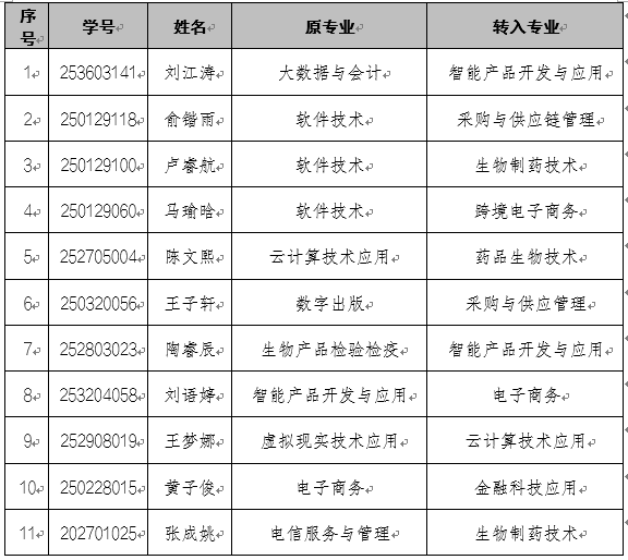 根据《省教育厅关于进一步加强和规范普通高等学校学生转专业工作管理的通知》(苏教学〔2014〕8号)、《退役军人保障法》第三十五条规定及我校《2015年转专业实施方案》等文件精神,现有刘江涛等十一位同学提出转专业申请,经教务处资格审核、转入学院对转专业学生考核,由学校校长办公会审议通过,具体名单如下: