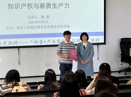 5月8日下午,我校科协在若水楼304举办了“知识产权与新质生产力”主题讲座,该讲座是由科协主办的“科普+产业蓄能”品牌学术活动之一,活动得到了2023年中国科协“翱翔之翼”大学生科技志愿服务项目资助。本次讲座邀请了苏州市知识产权保护中心预审业务部部长、江苏省知识产权骨干人才陶波作为主讲人,讲座由科协指导教师郑渊主持,金融科技学院院长宋翠玲、科研处副处长郇潇以及百余名师生到场聆听。