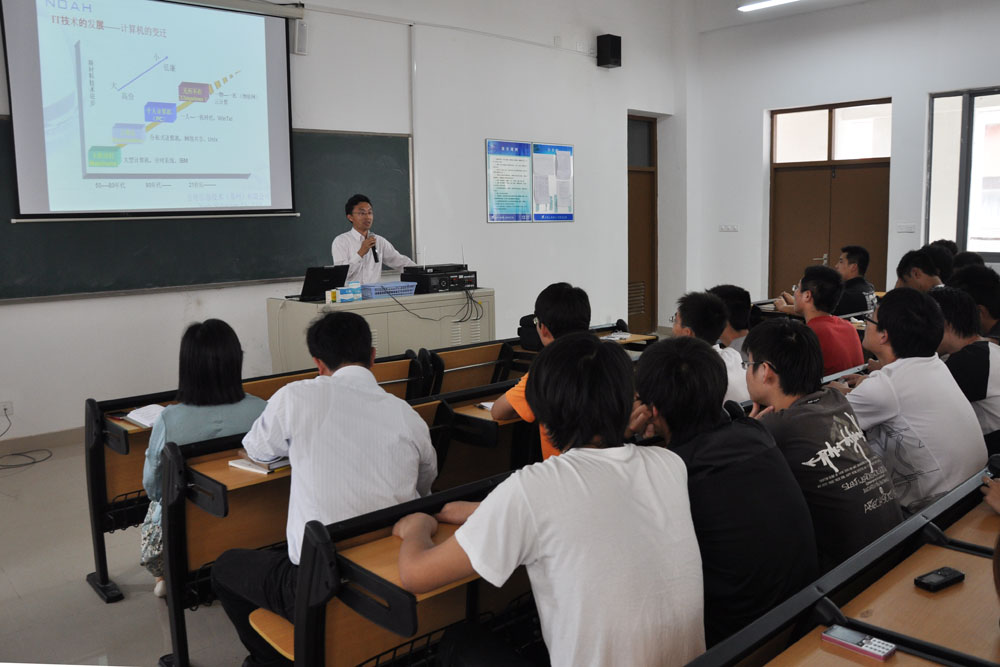 白教授首先介绍了自己的从学、从业、创业经历。随后,他简单介绍了计算机技术发展趋势和当今行业发展趋势,并对软件开发行业的主要情况,例如:软件分类、开发流程、职业分类和规划、企业分类及软件行业对人才的要求等方面作了一一介绍,让学生们对计算机软件行业有了深刻的认识。最后,作为博士生导师,白教授热情欢迎广大师生报考他的研究生,并欢迎大家到方舟公司实习。