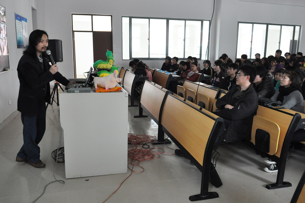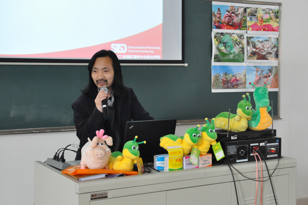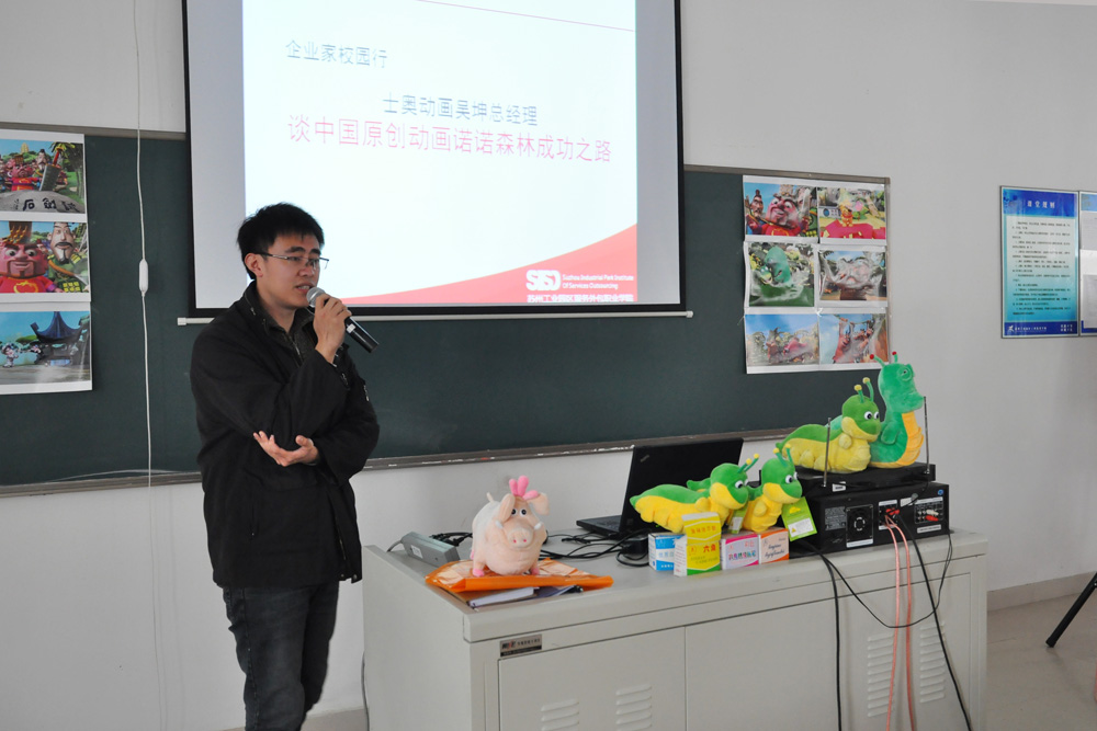 苏州士奥动画制作有限公司制作的《诺诺森林》已于2009年春节期间在中央电视台少儿频道播出,获得了观众和业界的一致认可和好评,《欢欢喜喜逛园林》和《珍珠贝贝》等原创动画项目也正在紧锣密鼓的筹划制作之中,吴坤先生就该公司制作的以上动画项目分析了中国原创动漫产业的现状和发展道路,并一一回答了同学们提出的问题,同时将携带的动漫衍生玩具赠送给提问的同学,形成了积极活跃的现场互动氛围。