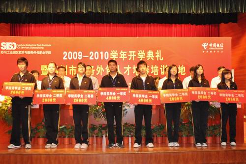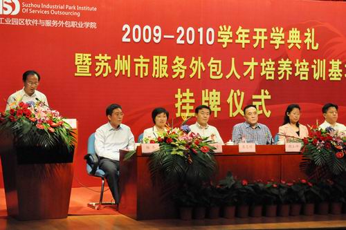 9月29日,苏州工业园区软件与服务外包职业学院隆重举行开学典礼暨苏州市服务外包人才培养培训基地挂牌仪式。副市长邱丽新,园区管委会杨知评主任、顾玉坤副主任,市教育局高国华副局长、园区教育局丁立新局长、徐金龙副局长等领导出席了典礼仪式。邱丽新副市长和杨知评主任共同为 “苏州市服务外包人才培养培训基地”揭牌。