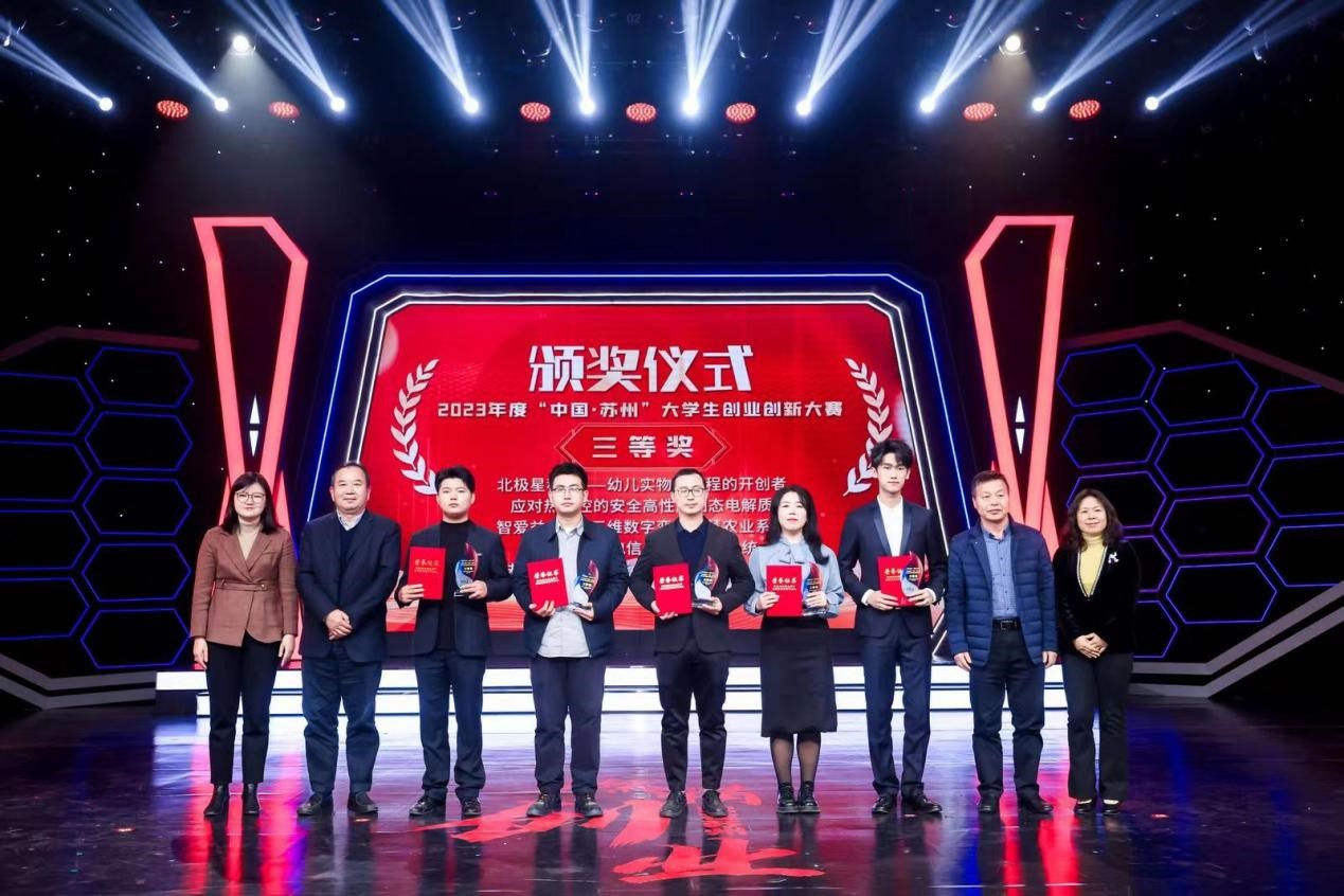 自2008年起,苏州市已是第16年连续举办燃情系列创业大赛,“中国·苏州”大学生创业创新大赛已成为苏州创业创新的标杆性赛事。活动现场通过视频形式回顾了大赛的激烈赛况和创业选手们的青春风采,并颁发2023年度“中国·苏州”大学生创业创新大赛总决赛一等奖、二等奖、三等奖。我校“北极星——幼儿实物化编程的开创者”项目作为本地高校的获奖团队代表上台领奖。