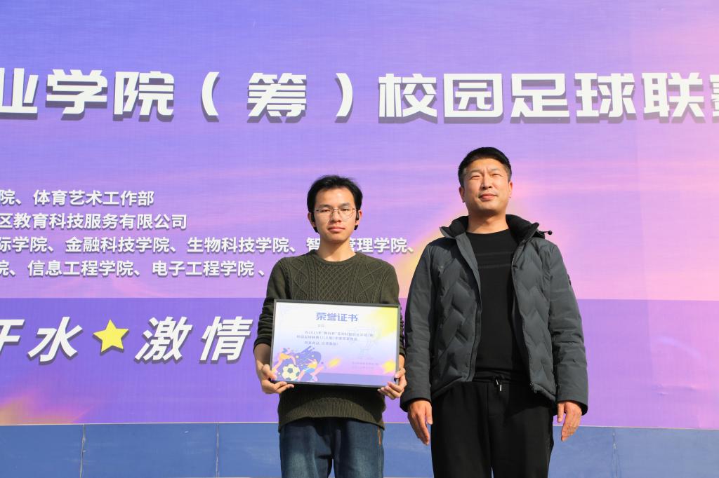 在冠亚军争霸赛中,智能制造学院代表队和国际学院代表队亮相赛场,上半场开场10分钟智能制造学院代表队先得1分,随后国际学院代表队展开反攻并屡屡得分,双方球员在比赛过程中拼尽全力,国际学院代表队最终拿下比赛冠军。冠亚军争夺战后,陈之酉和吴香涛分别为四强代表队、“最佳射手”和“最佳球员”颁奖。