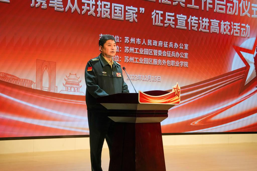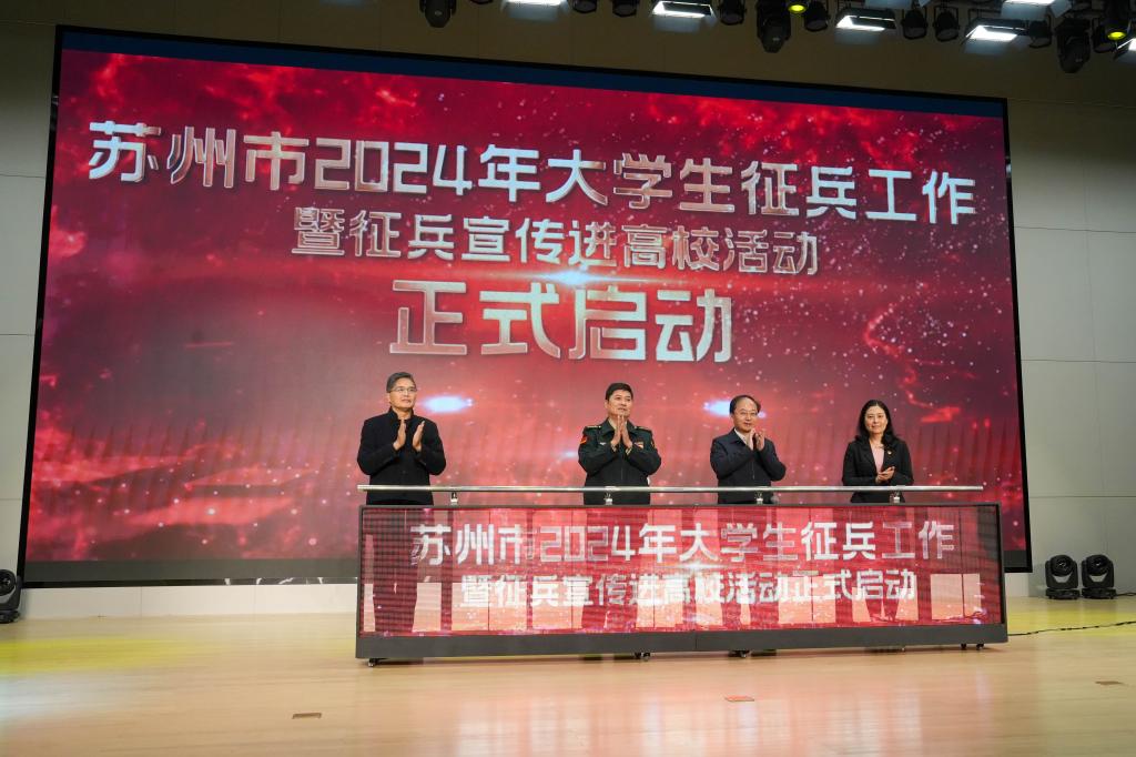 12月15日上午,苏州市2024年“携笔从戎报家国”征兵宣传进校园活动启动仪式在我校举行。苏州市征兵领导小组常务副组长、副市长查颖冬,苏州军分区大校司令员刘来贵,苏州市军分区党委委员、征兵办公室主任、苏州军分区动员处上校处长胡伟林,苏州工业园区党工委委员、政法委书记、管委会副主任姚文蕾,苏州工业园区社会事业局局长顾三强,我校党委书记严世清,党委副书记、校长权俊良,副校长顾伟国等出席仪式。苏州市各区县市人武部及驻苏26所高校人武部部长,我校部分师生代表等约800余人参加活动。