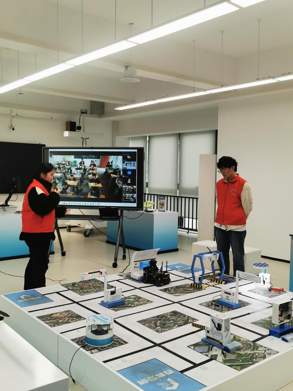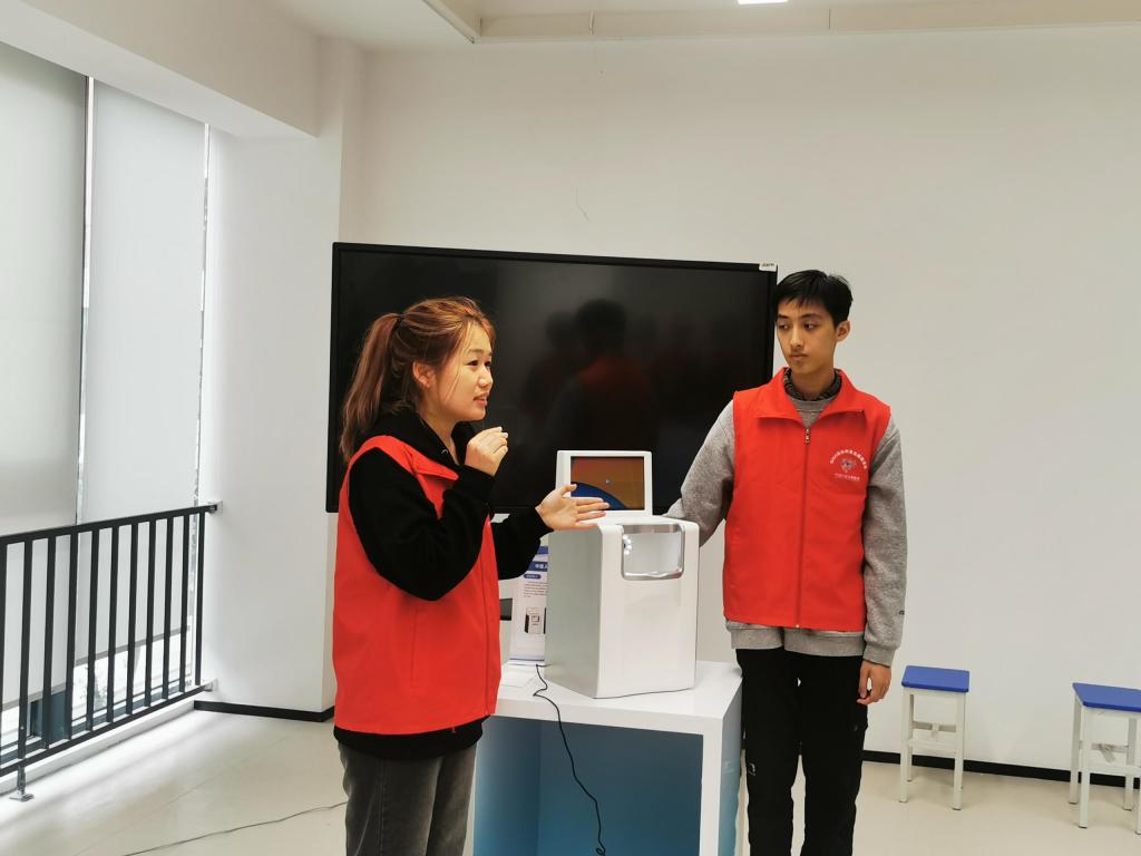 智能管理学院的大学生科协志愿者们分为不同小组展示了人工智能在不同领域的应用。陈新禹同学展示了智能制造机器人模拟物料搬运的过程。刘莘宇杰等同学演示了无人机如何跟随小车,介绍了该技术的基本原理及在不同领域的应用前景。唐立志等同学则介绍了智能小车在智慧交通沙盘中的通行,向孩子们展示了智能小车如何精确识别红绿灯、行人,准确判断路况。徐樊同学通过中医智能舌诊仪向孩子们展示了人工智能如何与传统中医结合,将舌诊过程数字化、客观化、智能化。
