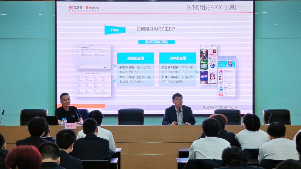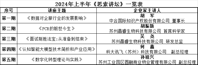 中合国际知识产权股份有限公司董事长胡军,苏州晶睿生物科技有限公司首席科学家胡振新、研发总监吴尧,科大讯飞(苏州)科技有限公司副总经理何鑫,苏州工业园区圆融商业物业管理有限公司副总经理孙祖兴应邀走进校园,与师生面对面,带来了5场各具特色的精彩讲座,内容覆盖了人工智能、大数据、生物医药等多个行业领域。