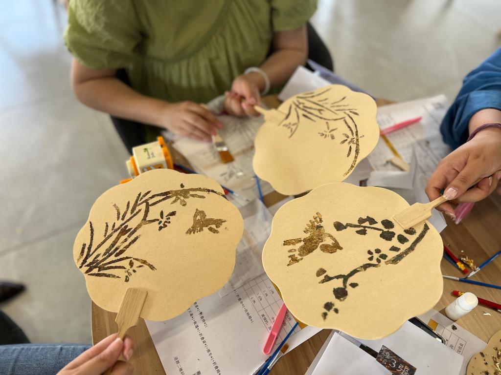 活动现场,指导老师为大家讲解和演示如何通过“画”“涂”“贴”“扫”等步骤,在扇面上勾勒出雅致美景。随后,大家纷纷拿起精心挑选的烧箔图案勾勒、拓印、点胶,胶水半干后将烧箔铺在扇面上,最后压实、清扫多余箔料,经过一个多小时的耐心制作,素雅的扇面渐渐被点缀成一幅幅流光绚烂的艺术作品。团扇轻摇,清风徐徐,烧箔独有的金属肌理感,辅以各异的图案,诠释出中式美学所蕴含的独特质朴优雅感。