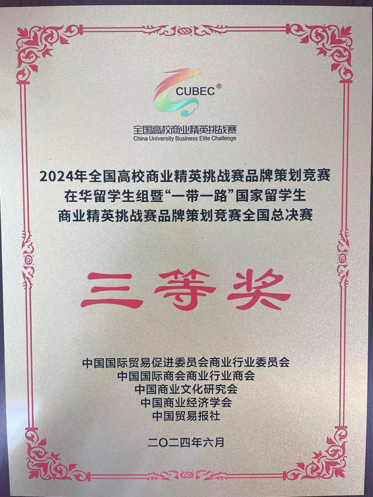 6月6日,由中国贸促会商业行业委员会、国际商会商业行业商会、商业文化研究会和中国贸易报社共同主办的2024年全国高校留学生商业精英挑战赛品牌策划竞赛全国总决赛在北京开赛。国际教育处组织我校留学生首次参加本次比赛,历经初赛、复赛和决赛的激烈比拼,我校留学生“SISO丝绸”团队的参赛作品《苏绣》在决赛中荣获三等奖。