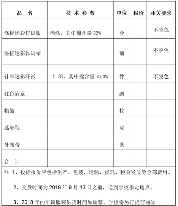 根据《中华人民共和国政府采购法》等有关规定,本着“公开、公平、公正”的原则,现针对军训服装向社会公开招标,欢迎具有相应资质和供应能力的单位参加投标,具体内容如下: