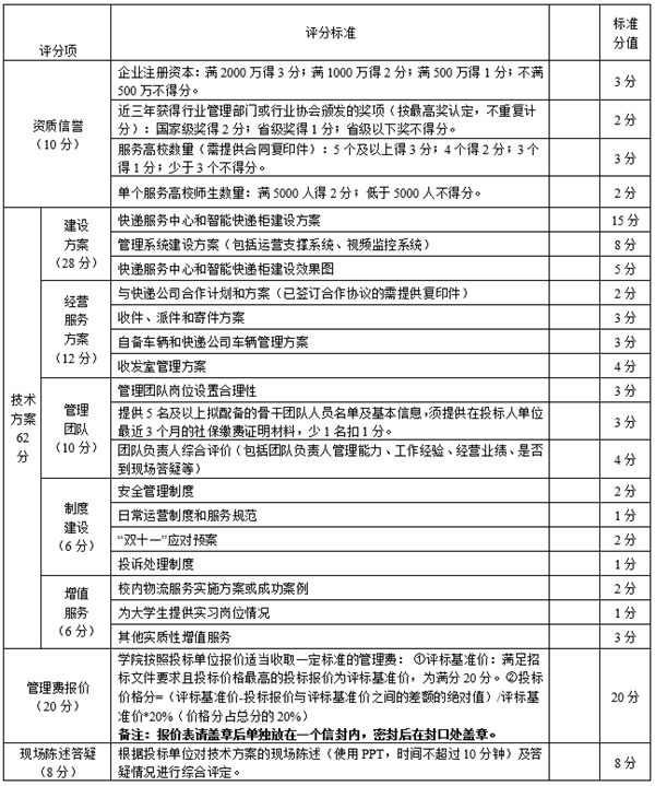 学院现有学生5200余人,教师300多人,以及入住培训生、企业人员若干。学校将通过公开招标方式,选择一家服务商(即:第三方企业),由服务商为师生提供智能化的快递服务。